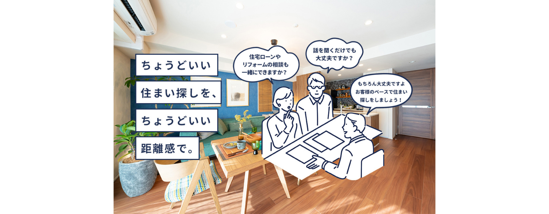 「ちょうどいい住まい探しを、ちょうどいい距離感で。」をコンセプトにお子様連れの家族や女性おひとりでも気軽にお問い合わせ・来店できる店舗づくりで、暮らしの探究家としてお客様一人ひとりが安心して相談できる環境を創り出し、住まい探しをする全ての方へ最適な暮らしをご提案いたします。