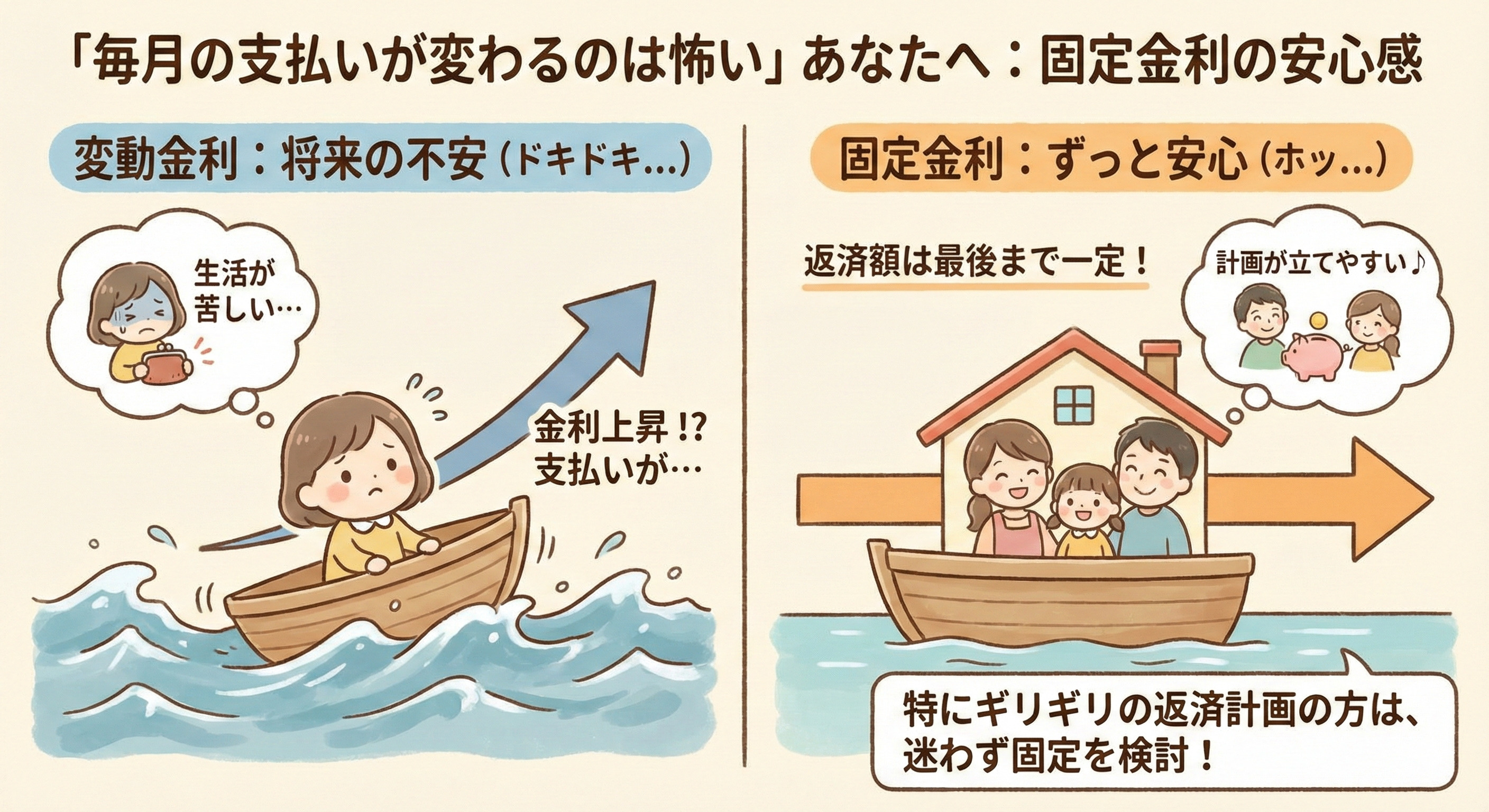 特に「これ以上金利が上がると生活が苦しい」というギリギリの返済計画の方は、迷わず固定(または当初固定)を検討してください。